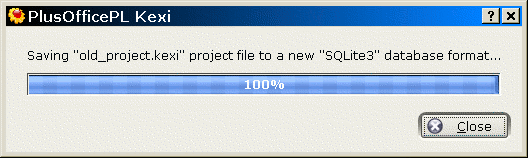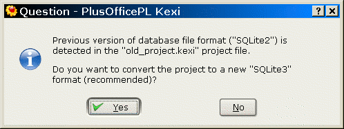 2. Support for newest SQLite 3 database file formatSQLite 3 introduced new, awesome database file format, which is incompatible with SQLite 2 format. Kexi, however, offers automatic migration for existing .kexi project files, from SQLite 2 to SQLite 3 format. Let's suppose we've clicked old_project.kexi file on our desktop. With current (pre beta5) Kexi version you can get following question: