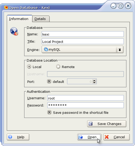 Database server connection dialog